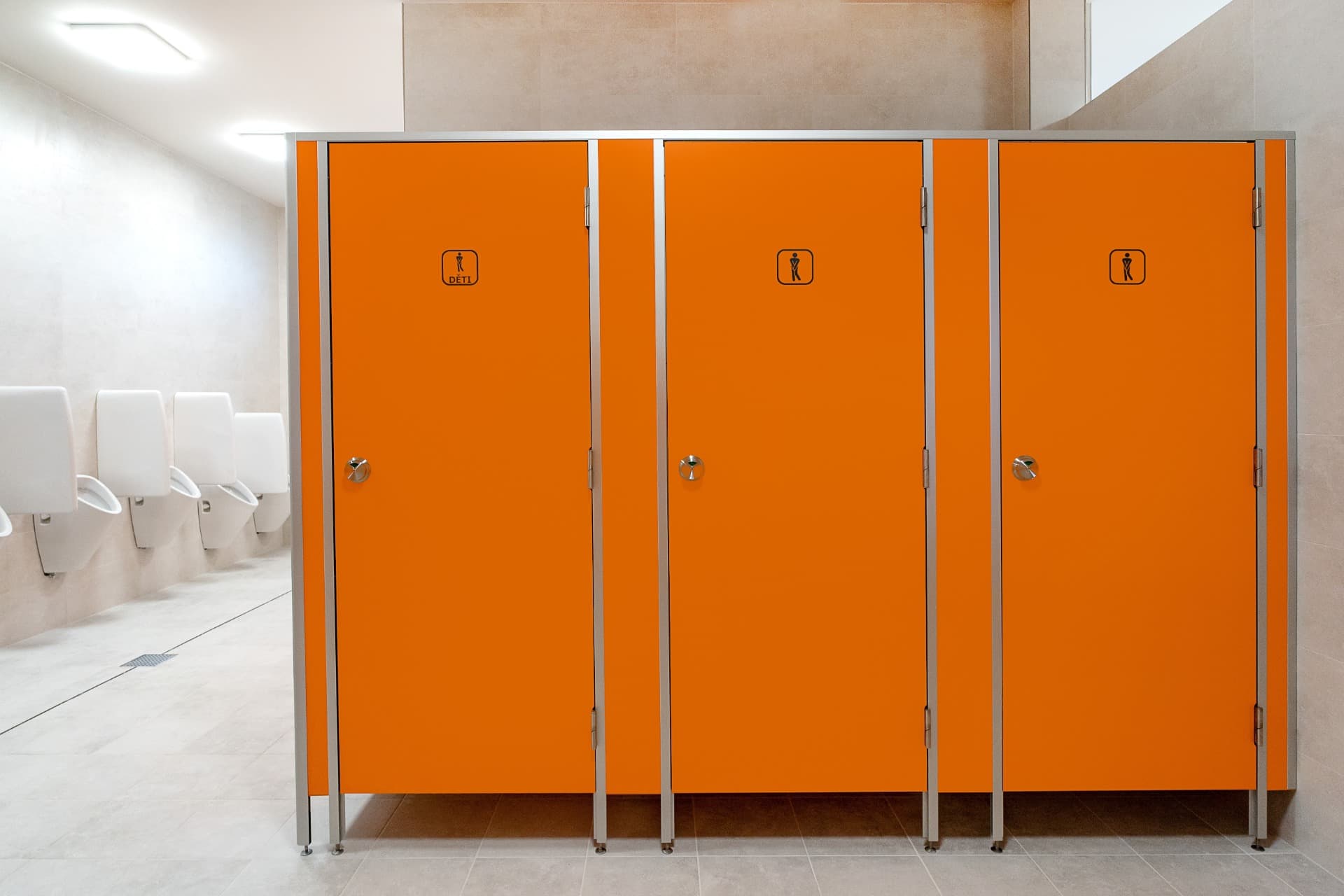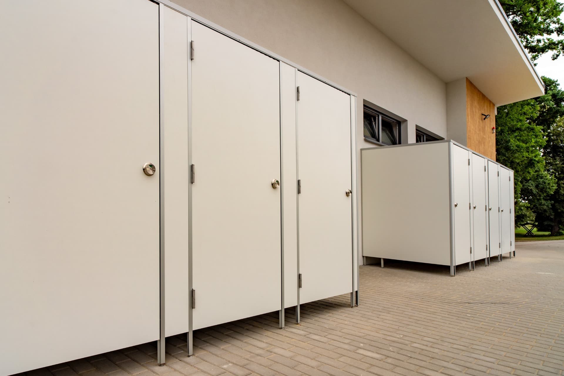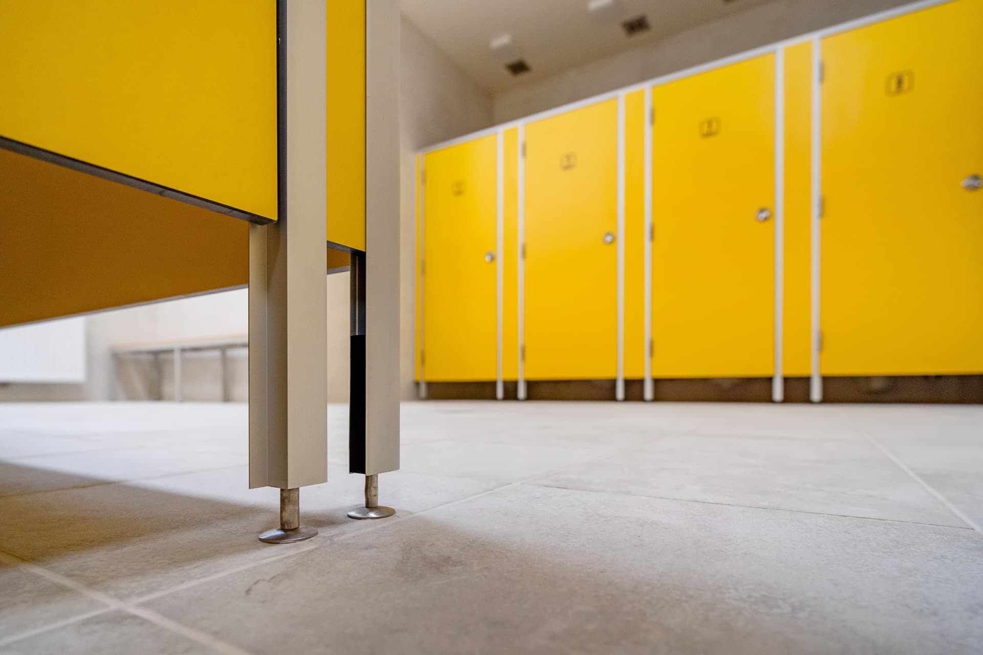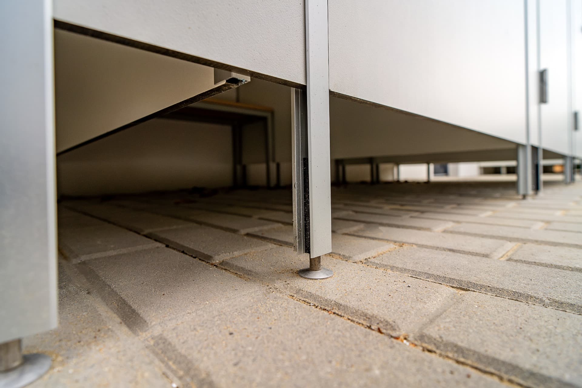 Celá konstrukce sanitárních příček je usazena na stavitelných nožičkách v nerezovém provedení o výšce 150 mm, které umožňují vyrovnávat nerovnosti podlahy.