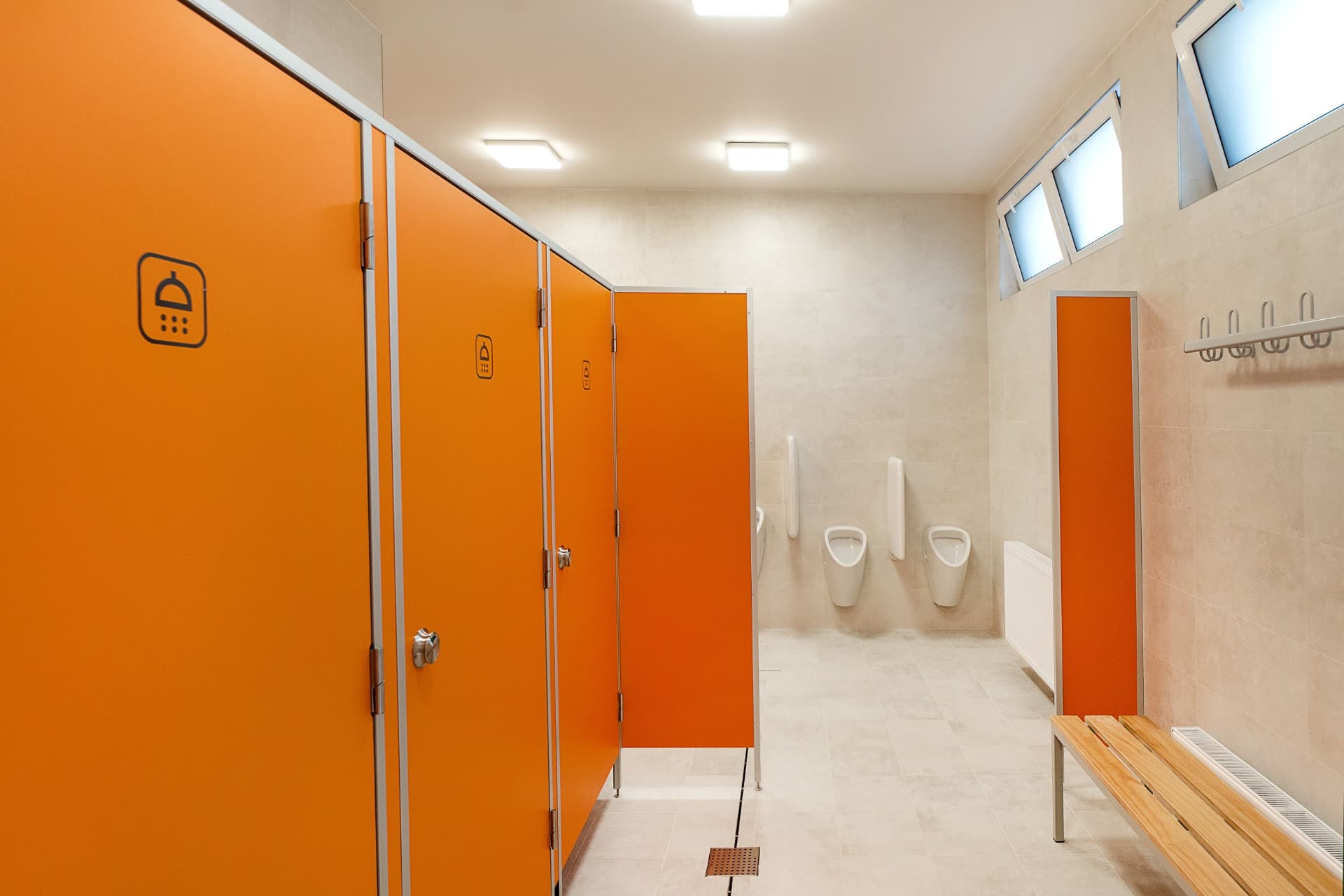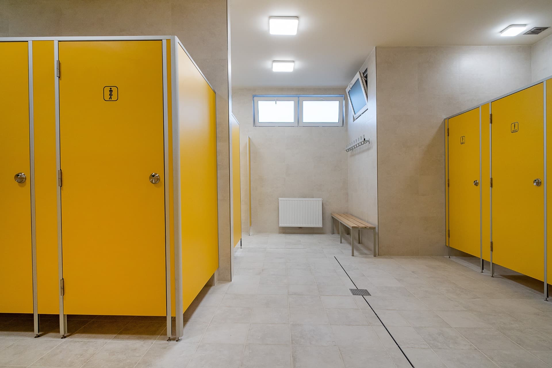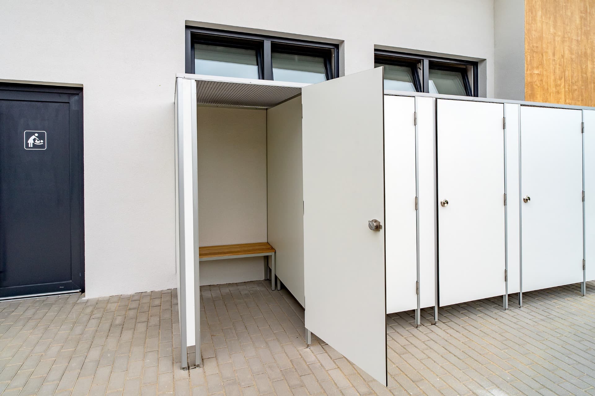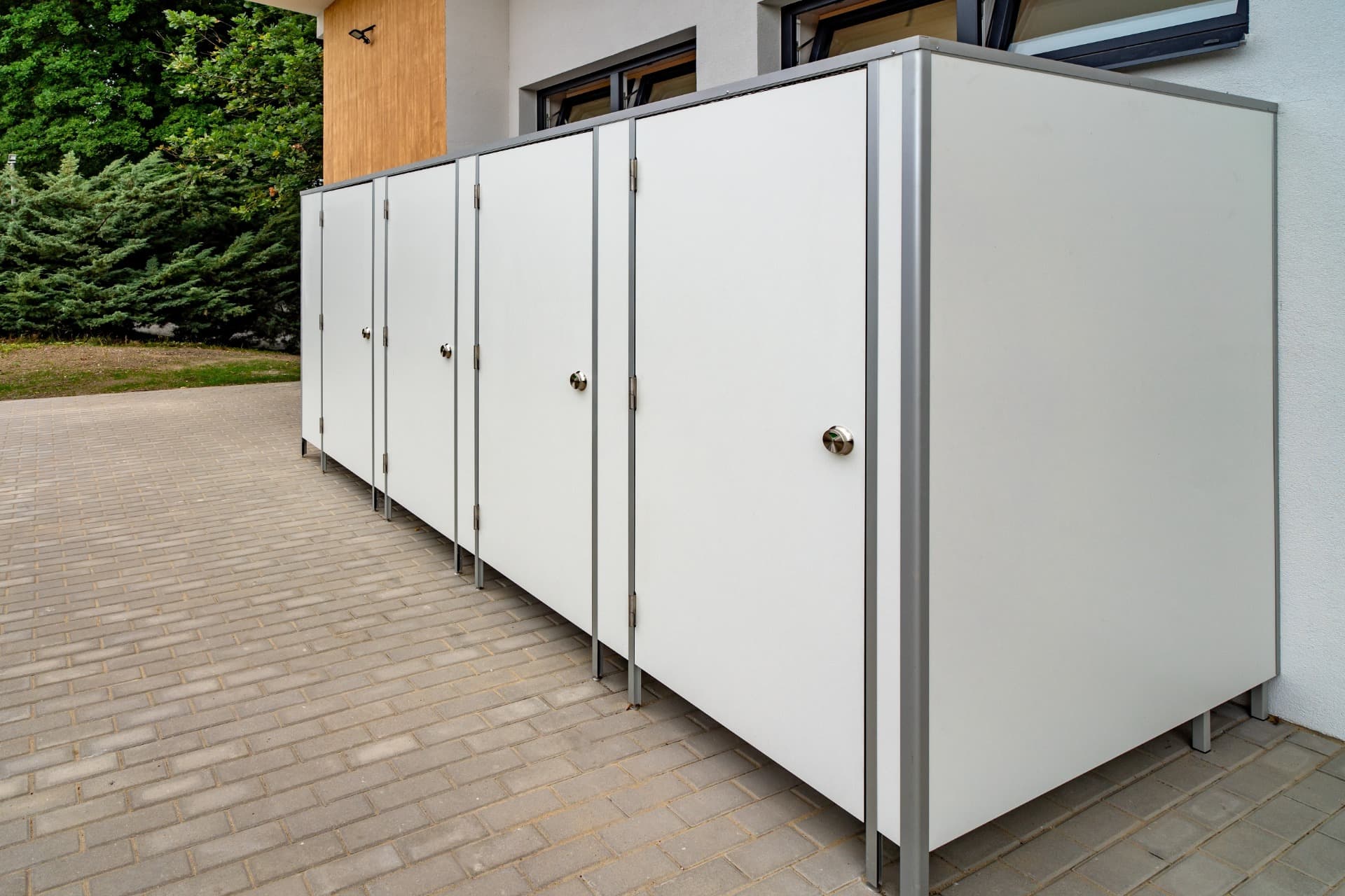 Celá konstrukce sanitárních příček je usazena na stavitelných nožičkách v nerezovém provedení o výšce 150 mm, které umožňují vyrovnávat nerovnosti podlahy.