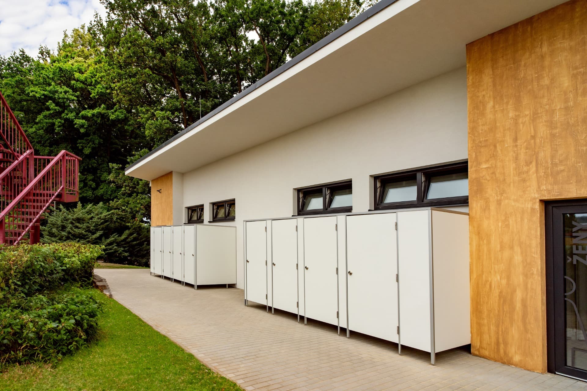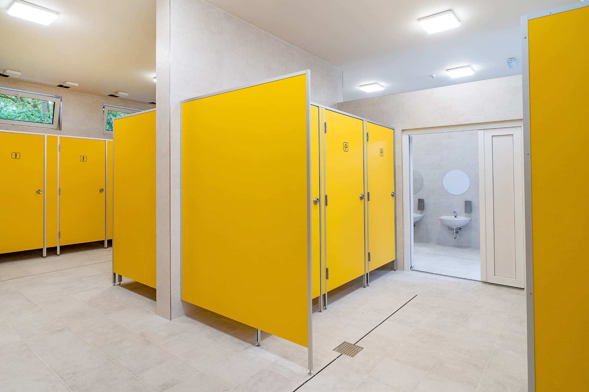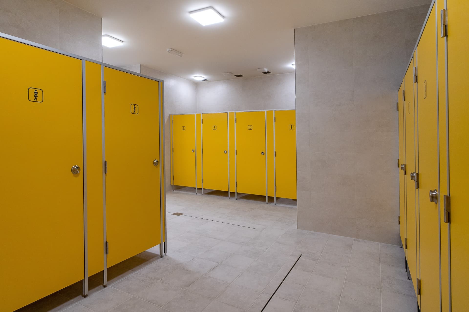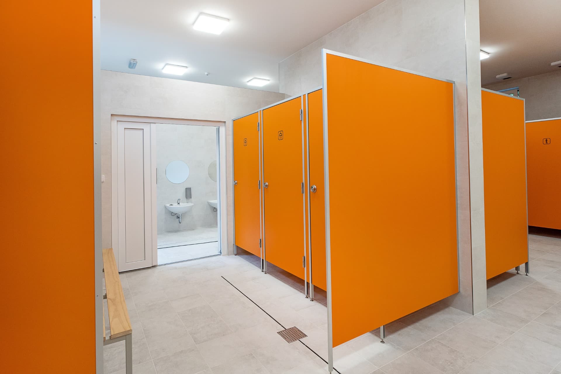 Celá konstrukce sanitárních příček je usazena na stavitelných nožičkách v nerezovém provedení o výšce 150 mm, které umožňují vyrovnávat nerovnosti podlahy.